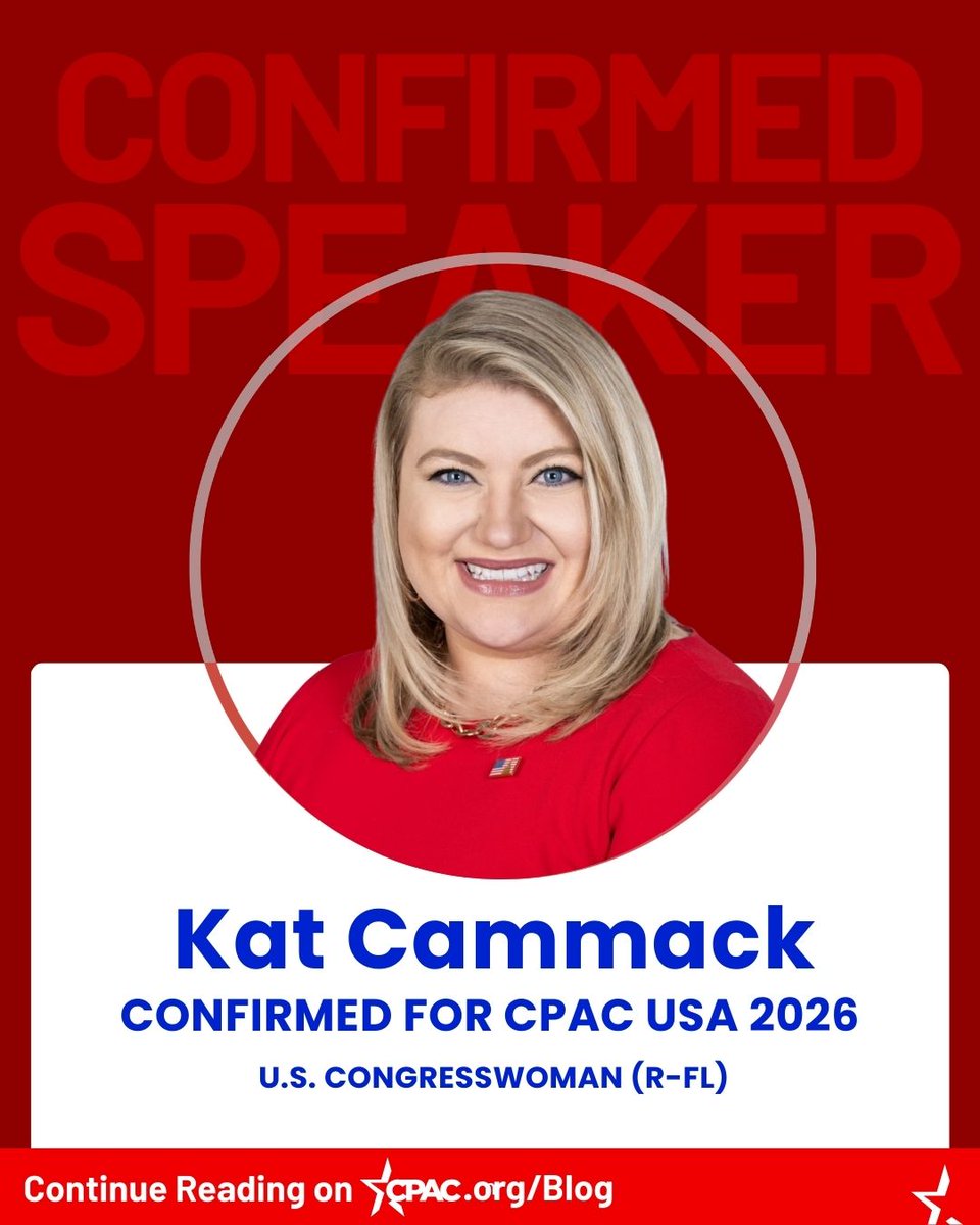 CPAC is proud to announce that Florida Congresswoman Rep. Kat Cammack (94% CPAC Rating) is a confirmed speaker for CPAC USA 2026 in Grapevine, Texas, March 25-28.